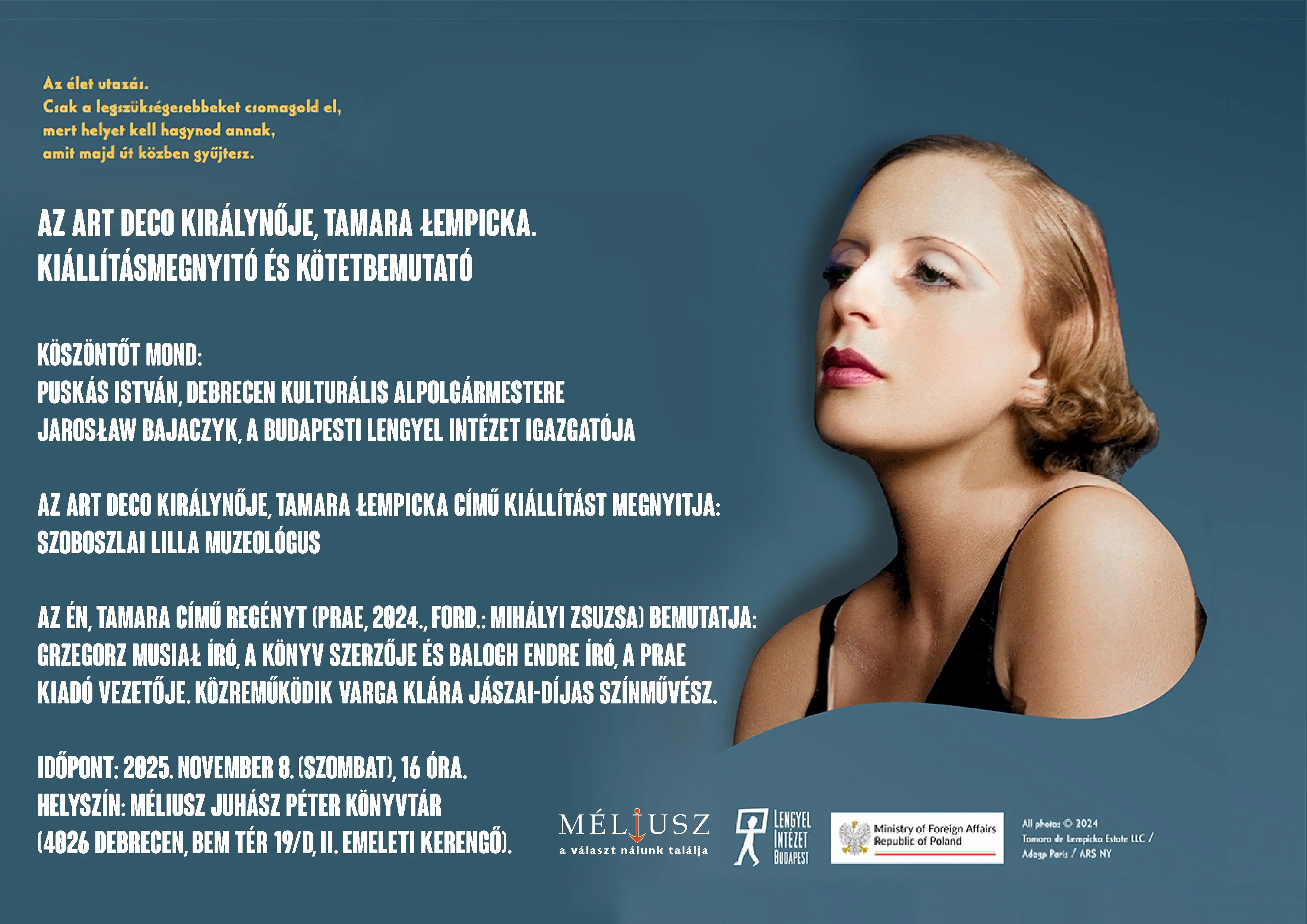 Az art deco királynője, Tamara Łempicka címmel a világhírű festőnő életének legfontosabb állomásait, és válogatott reprodukcióit bemutató tablókiállítás nyílik a budapesti Lengyel Intézet és a Méliusz Juhász Péter Könyvtár együttműködésének eredményeként november 8-án, szombaton, a könyvtár központi épületében (Bem tér 19/D). A kiállítás a művész munkásságát és lebilincselő életútját bemutató programsorozat kelet-magyarországi állomása. Ebből az alkalomból Debrecenbe látogat az Én, Tamara című életrajzi regény szerzője, a kiváló lengyel író, Grzegorz Musiał is, akinek – Mihályi Zsuzsa fordította és a Prae Kiadó gondozásában frissen megjelent – könyve betekintést enged az 1920-as, ’30-as évek Párizsának ellenállhatatlan, dekadens, pezsgő művészvilágába. A kiállítást Szoboszlai Lilla muzeológus nyitja meg, köszöntőt mond Puskás István kulturális alpolgármester és Jarosław Bajaczyk, a Lengyel Intézet igazgatója. Grzegorz Musiał-t Balogh Endre író, a Prae Kiadó vezetője kérdezi.