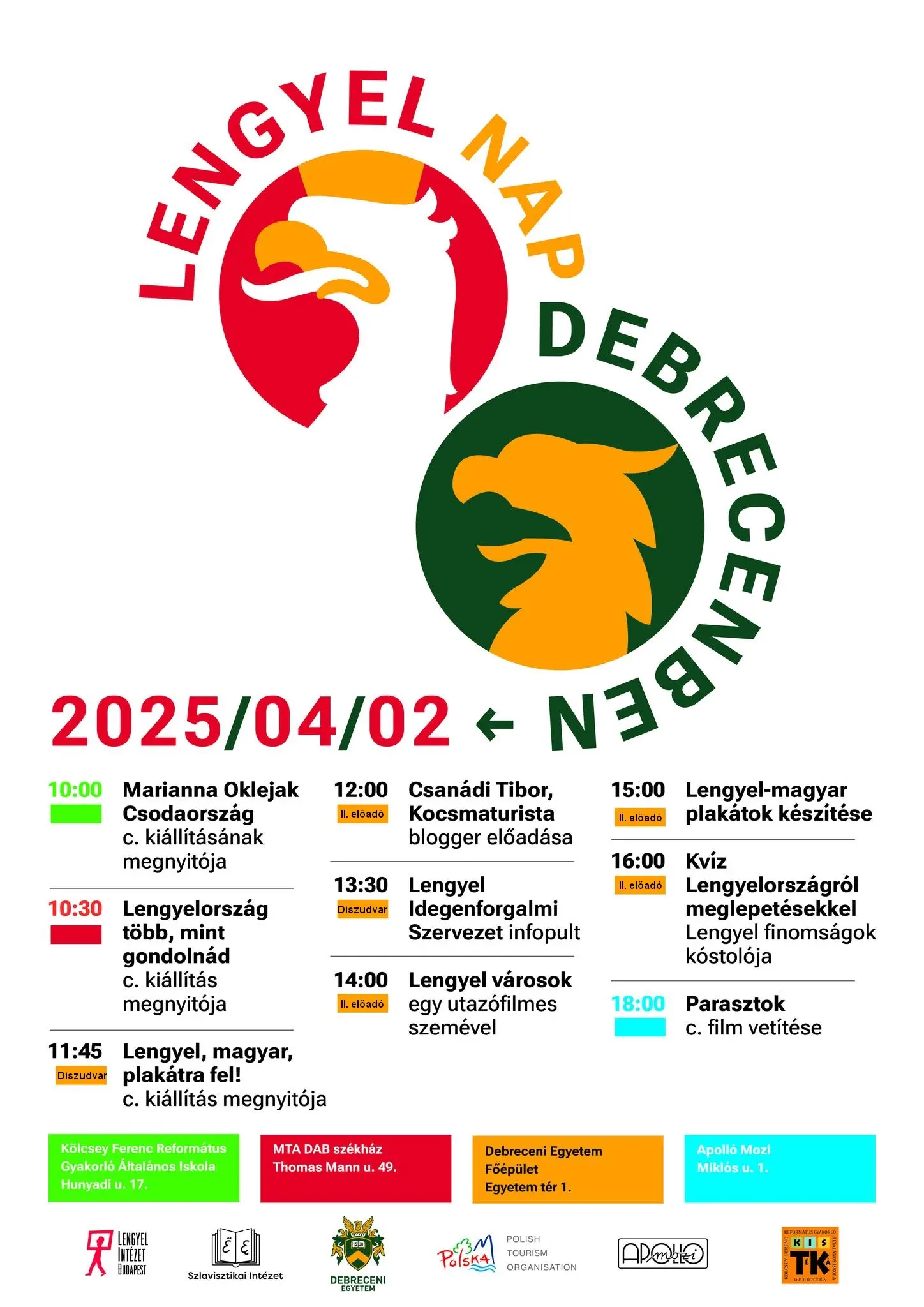 A Debreceni Egyetem Szlavisztikai Intézete, a budapesti Lengyel Intézet, valamint a Lengyel Idegenforgalmi Szervezet szeretettel várja az érdeklődőket a 2025. április 2-án megrendezésre kerülő Lengyel Napra, ahol közelebbről is megismerhetjük Lengyelországot, a lengyel történelmet és kultúrát, a fontosabb lengyel városoktól és tájegységektől, hagyományoktól, népszokásoktól kezdve a gasztronómián keresztül a tanulmányi lehetőségekig, ösztöndíjprogramokig, álláslehetőségekig.
